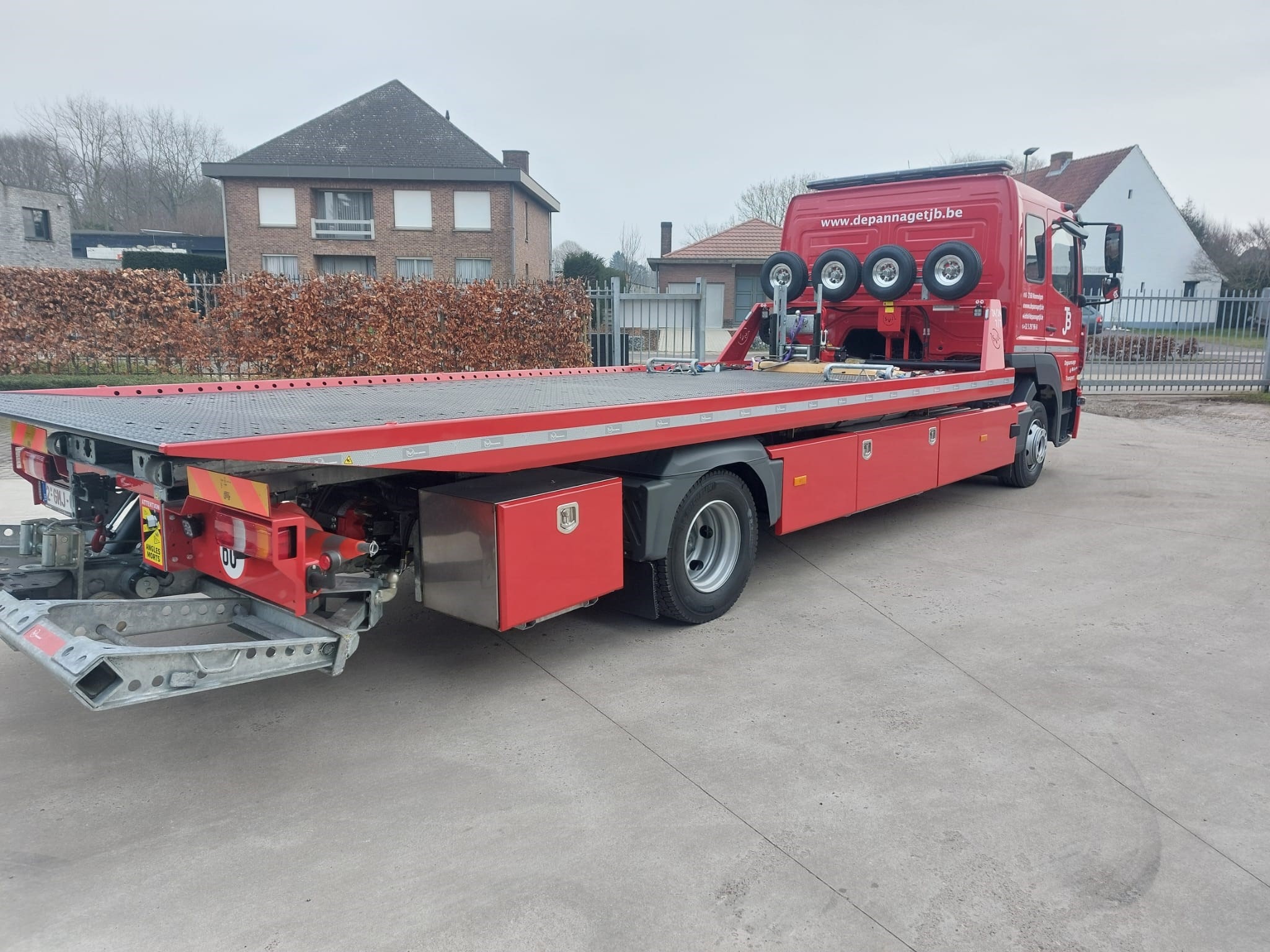 Deze Mercedes Atego werd opgebouwd met een schuifplateau 5,5 T en een brilsysteem 3 T/M. Op de bril werd een hydraulische lier gemonteerd. Daarnaast werd het depannage voertuig compleet uitgerust met accessoires zoals een krikvoorziening, luchthaspel, motosteun, high speed dollies met houder, led strips in de koffers, plastic kisten in de koffers, vastzetogen, ...